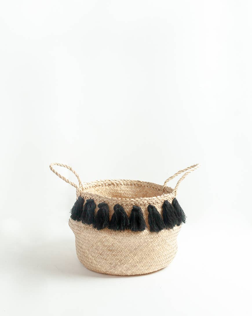 These beauties were designed with versatility and function in mind. Long black tassels add a modern element to a traditional Vietnamese seagrass belly basket.