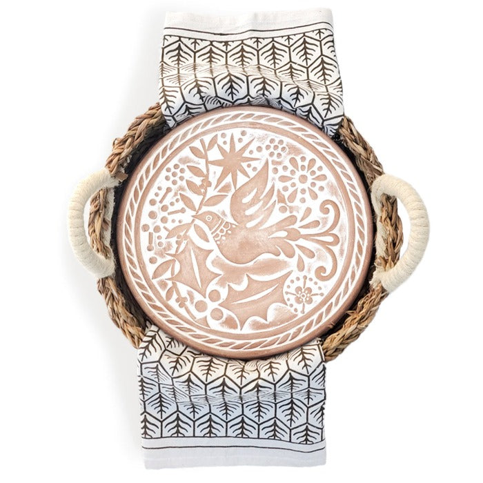 Add a bit of artisan-inspired style to the kitchen with a terracotta bread warmer and hand screen printed tea towel. Engraved with a bird design and cut to fit neatly into a round basket, this terracotta special bread warmer is naturally insulating, and the basket itself has been handwoven from sustainably grown seagrass. The tea towel is great for drying dishes or hands in the kitchen, lining a bread basket. They are the best gift items for anyone who loves bread!