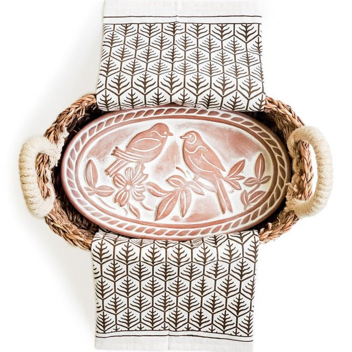Add a bit of artisan-inspired style to the kitchen with a terracotta bread warmer and hand screen printed tea towel. Engraved with lovebirds design and cut to fit neatly into an oval basket, this terracotta special bread warmer is naturally insulating, and the basket itself has been handwoven from sustainably grown seagrass. The tea towel is great for drying dishes or hands in the kitchen, lining a bread basket. They are the best gift items for anyone who loves bread!