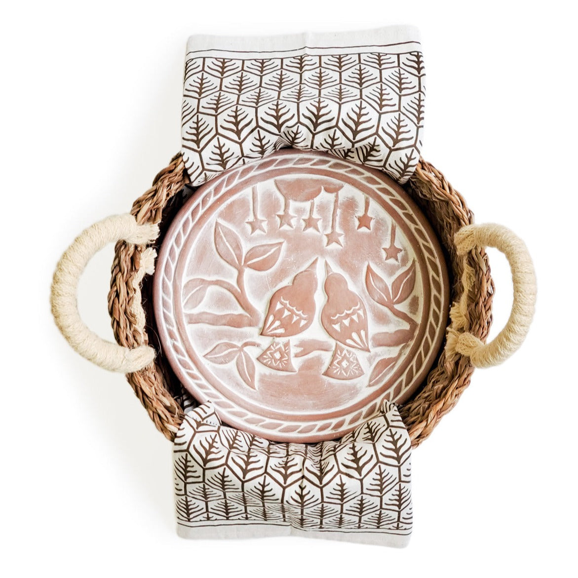 Add a bit of artisan-inspired style to the kitchen with a terracotta bread warmer and hand screen printed tea towel. Engraved with lovebirds design and cut to fit neatly into a round basket, this terracotta special bread warmer is naturally insulating, and the basket itself has been handwoven from sustainably grown seagrass. The tea towel is great for drying dishes or hands in the kitchen, lining a bread basket. They are the best gift items for anyone who loves bread!