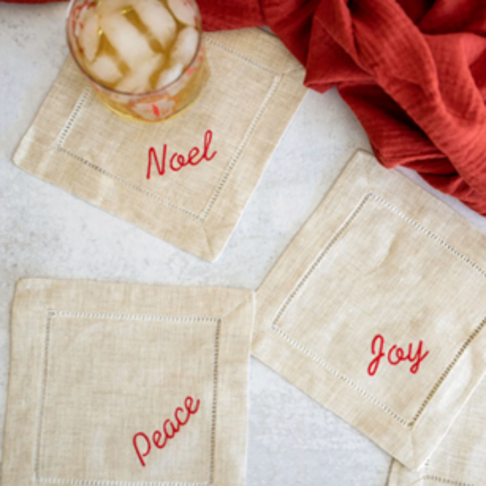 Classic and festive! 100% linen coasters, each embroidered in red with a different holiday word: Joy, Noel, Merry and Peace.