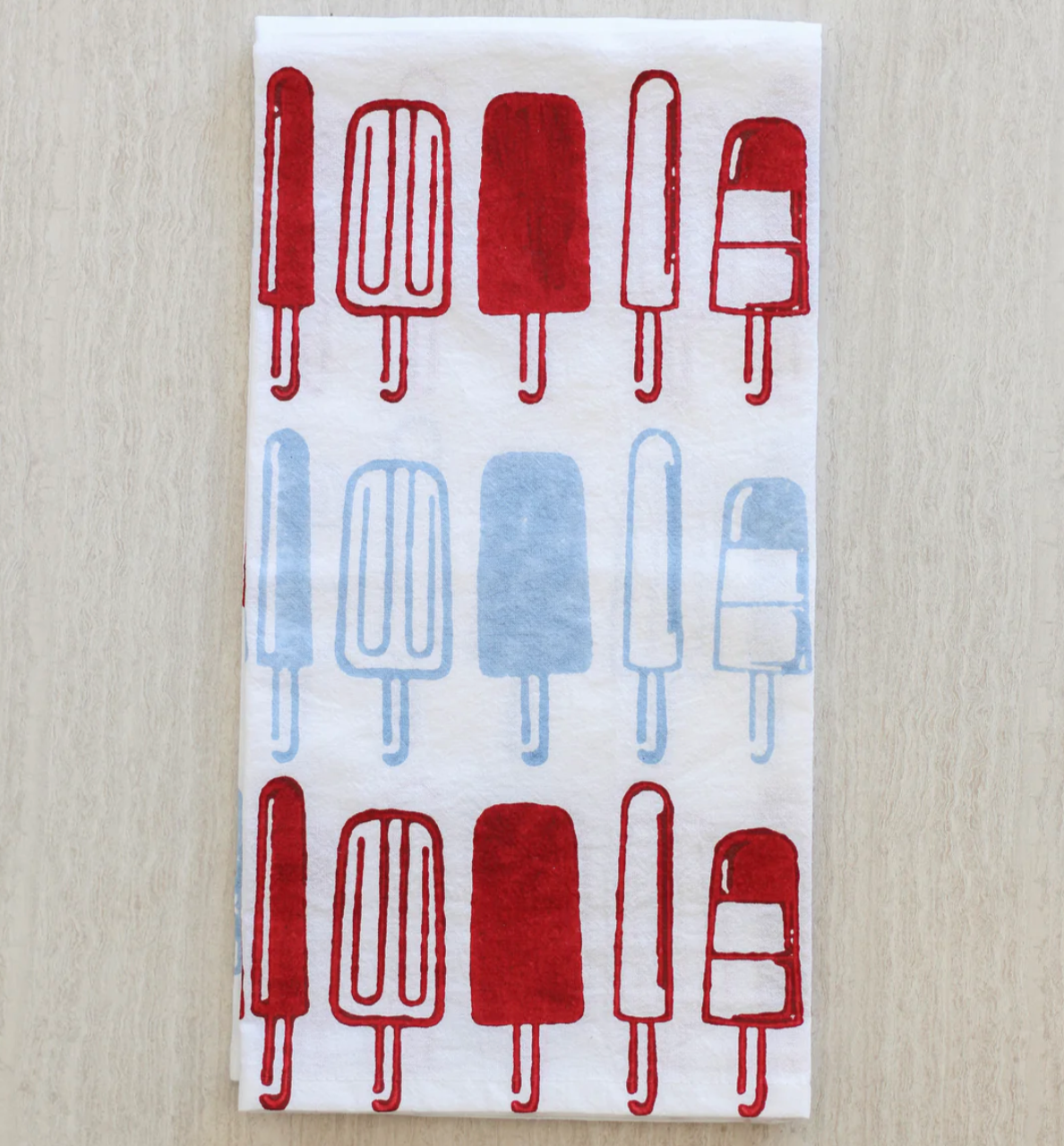 Each towel is individually hand blocked printed with a Popsicle design in bold red and blue tones, making it a playful addition to your summer decor. Whether you’re drying dishes, wrapping baked goods, or creating a thoughtful gift set, these towels are made to be used, loved, and shared.