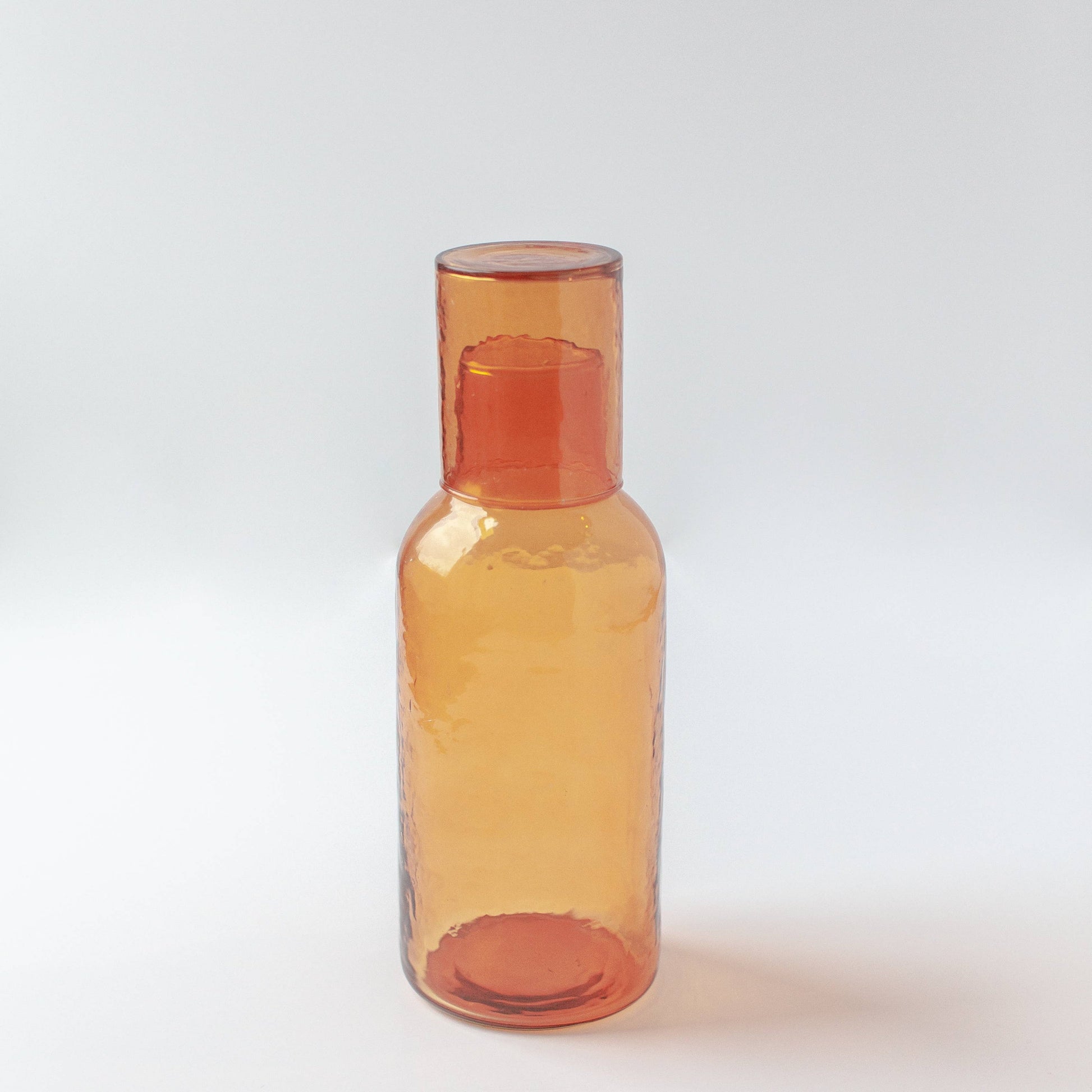 Form meets function in these stunning glass carafes. Each is handblown from recycled glass then meticulously hammered by hand for a truly unique finish. The set includes a carafe and lid that doubles as a small drinking glass.