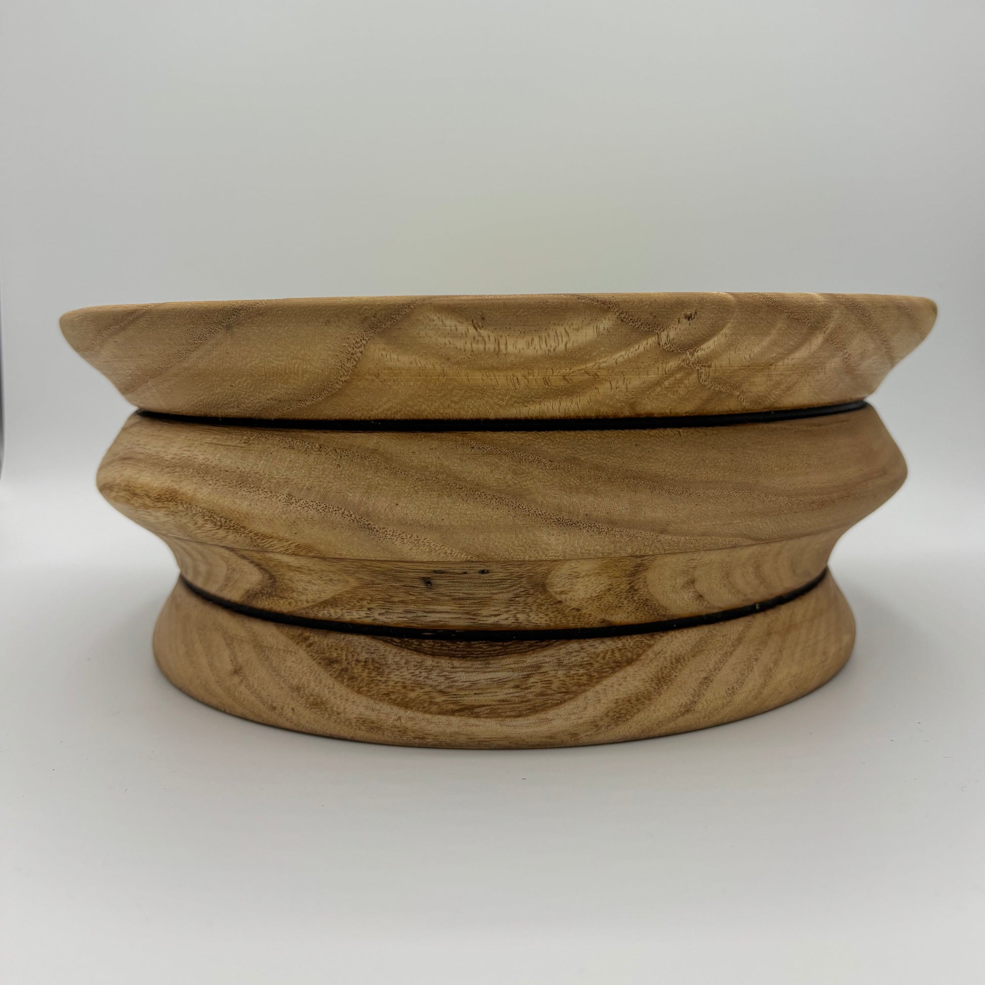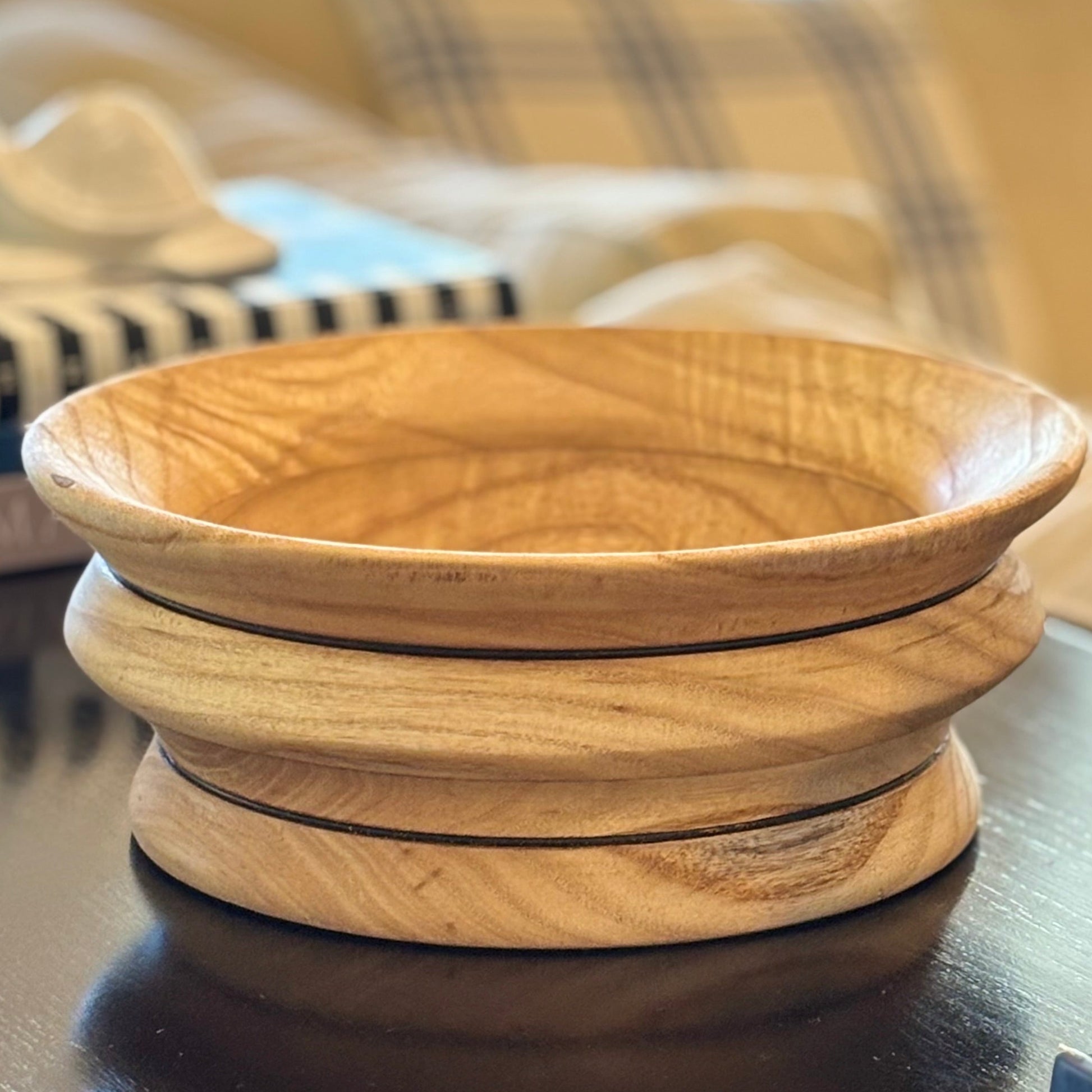 Presenting our magnificent Limited Edition Paulownia Wood Bowl, masterfully crafted by artisan Douglas Price. With its expansive 11" width and stately 4 1/4" height, the bowl boasts two black-striped carvings, adding a touch of sophistication to its rustic charm. This versatile bowl is perfect for showing off your favorite fruits, salads, or tasty treats with style. Or simply use it as a stunning decorative bowl on your entryway table or shelf.