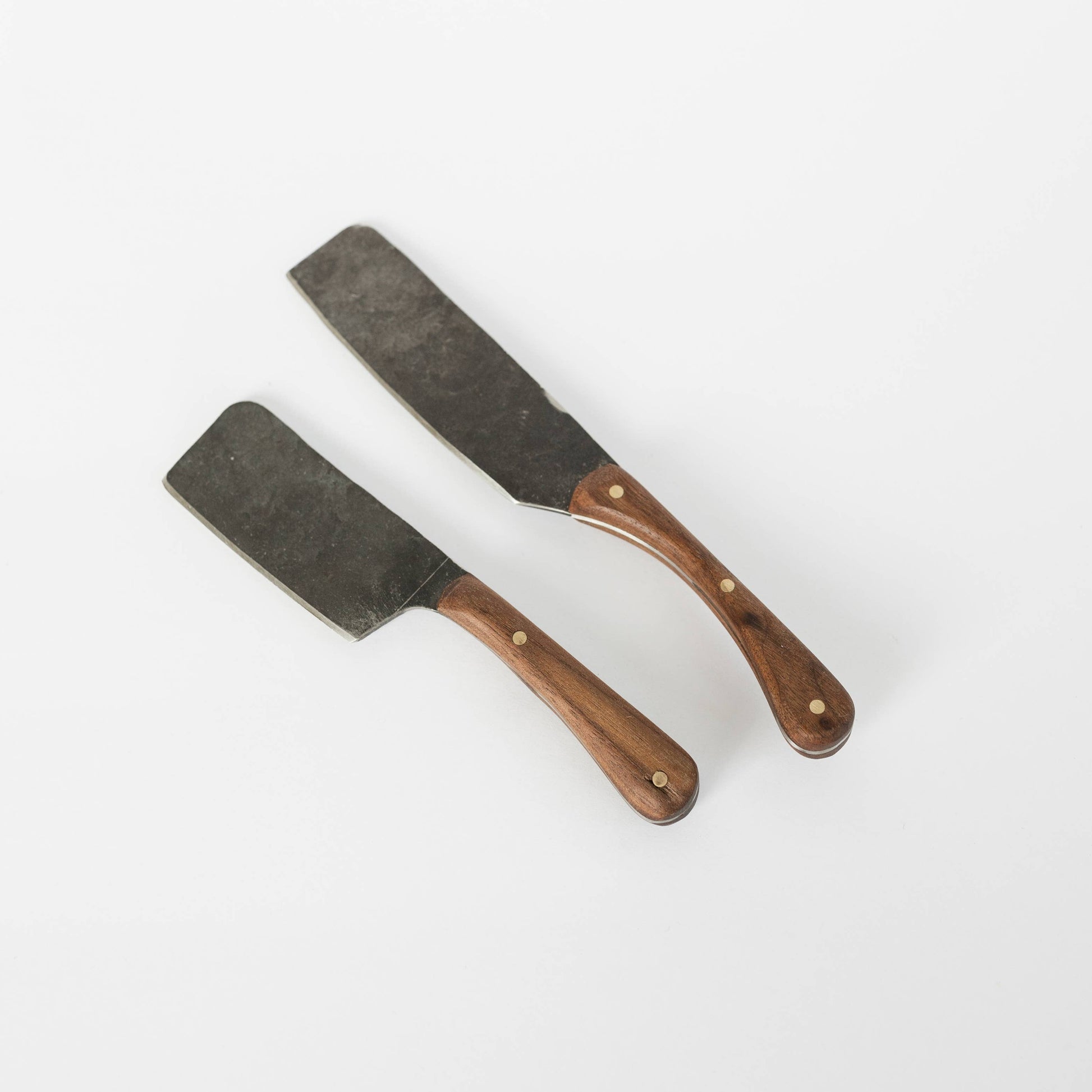 Hand-forged and shaped, each uniquely handmade stainless steel knife is finished with food grade oil. Makes a perfect hostess gift with a block of hard cheese or a cutting board.