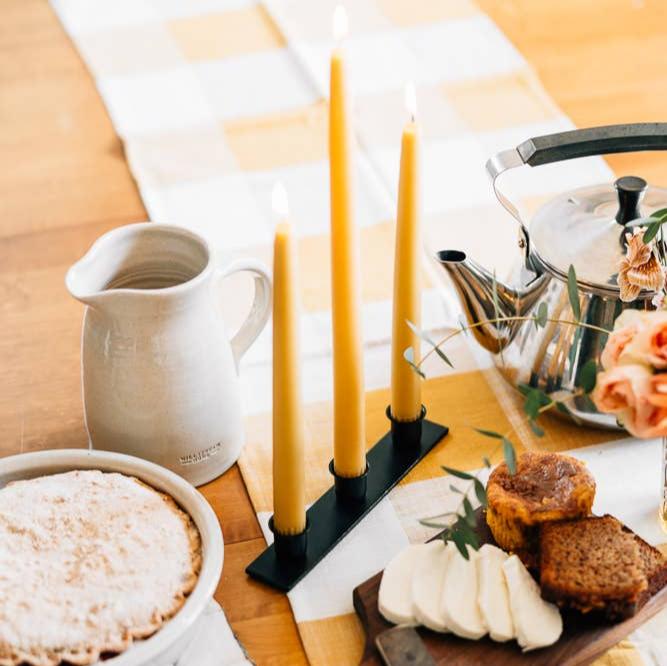 Handmade with heavy-duty iron, this Metal Taper Candle Holder is made to last. Both practical and beautiful, its design is simply elegant. Handmade in Pennsylvania Pairs perfectly with our hand-dipped taper candle collection American Made