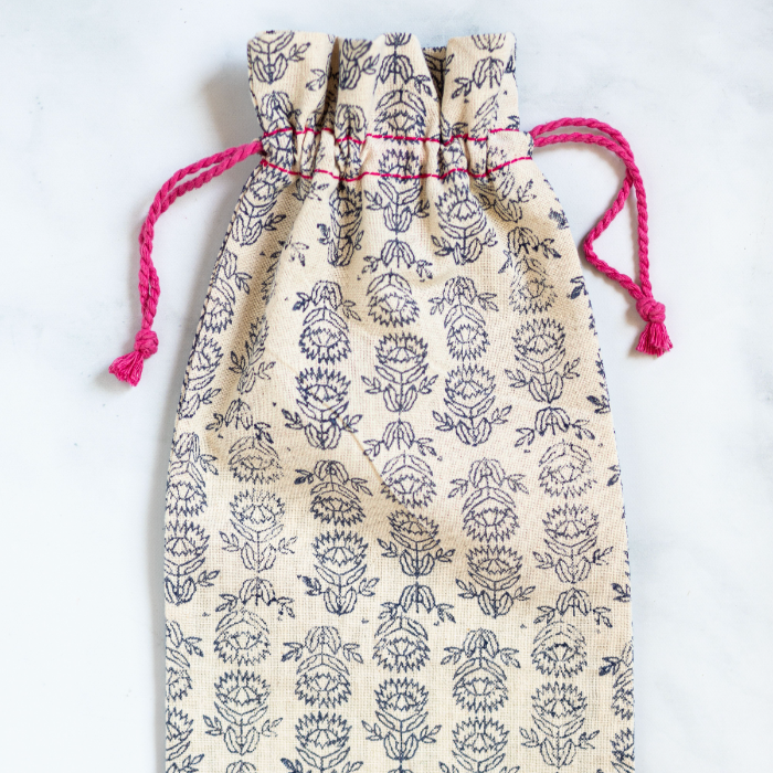 Make every gift-giving moment extraordinary with our Wine Gift Bag in timeless navy 100% flax cotton linen material, hand block printed by survivors of modern-day slavery. The delicate pink thread and Protea motif add a touch of elegance and grace to your thoughtful gesture.