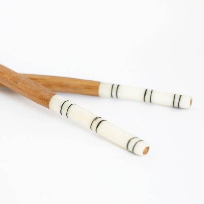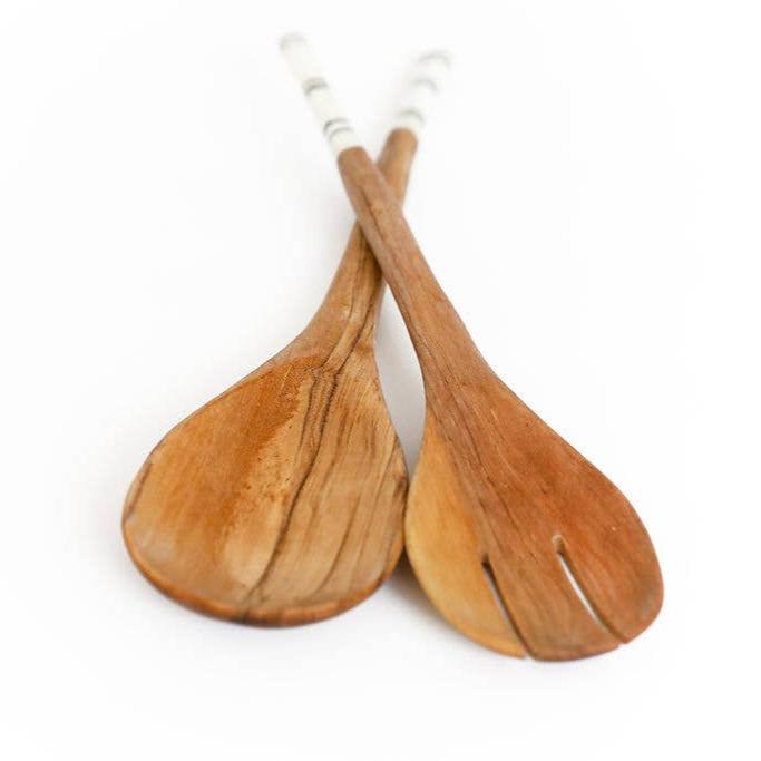 Our fair trade serving spoon set is handcrafted from African mahogany (wild olive) wood with inlaid with batiked, recycled bone handles. Hand wash. Bone in this product is sourced primarily from goats. The production process utilizes zero-waste practices in using goats for meat, leather, and bone.
